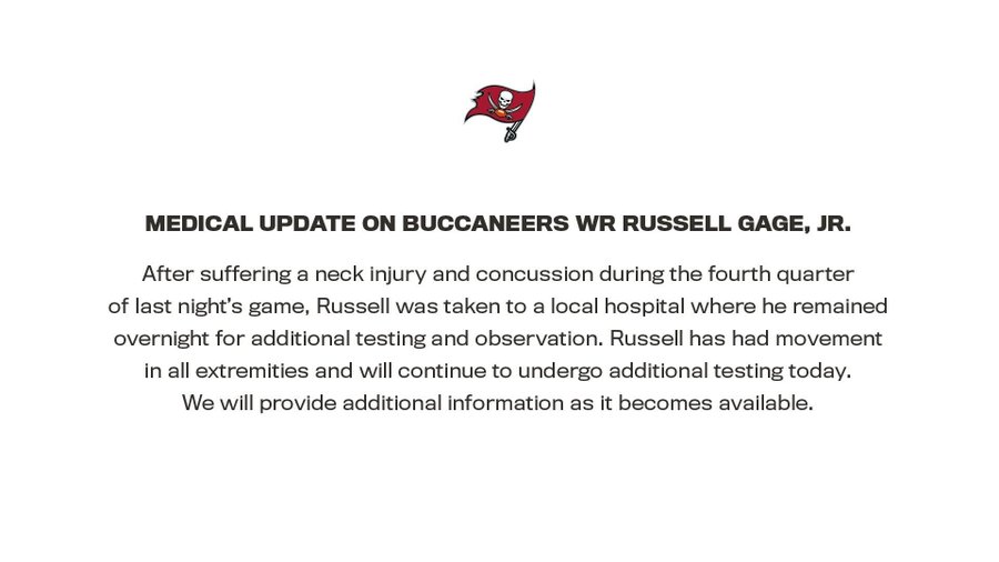 1 day agoInjuries to Russell Gage Damar Hamlin on Monday Night Football are why the NFL needs guaranteed contracts Thoughts and prayers wont fix this the players union taking a. Late in Monday nights loss to the Dallas Cowboys Tampa Bay Buccaneers wide receiver Russell Gage suffered what initially appeared to be a horrific neck injury. 2 days agoGage was loaded onto a backboard before leaving the field.
